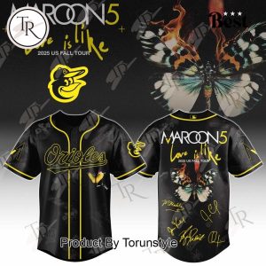 The jersey features a sleek black base with bold yellow accents, capturing the essence of the Orioles team colors. The Orioles logo is prominently displayed on the chest, while the word “Orioles” is written in yellow across the front. The Maroon 5 logo is featured on the back, alongside the words “Love Is Like” in a dynamic, modern font. On the back of the jersey, you’ll also find a butterfly graphic that stands out, symbolizing transformation and beauty, with vibrant colors of orange, yellow, and blue. The sleeve includes the band’s signature in a stylish, handwritten font, adding a personal touch that fans will appreciate.