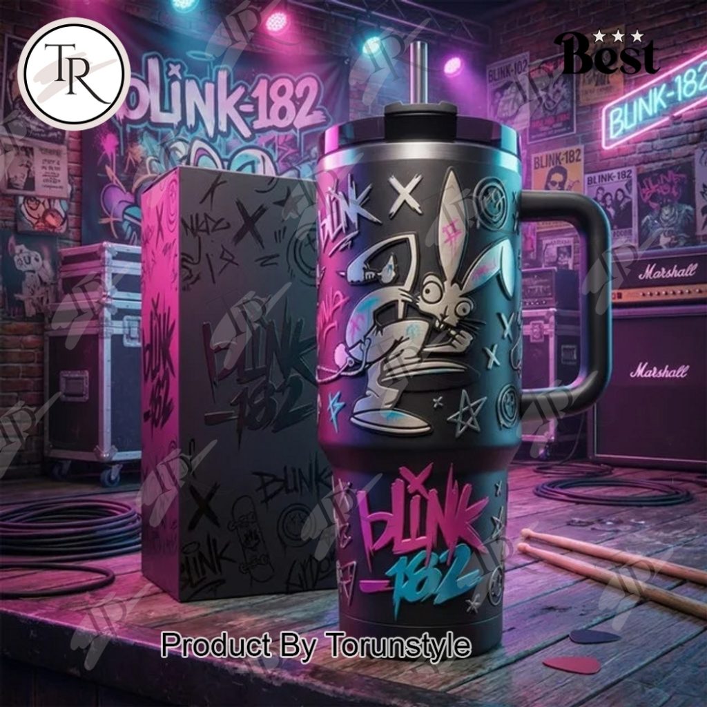 Front and center, the focal art is a wide-eyed cartoon character with long ears (rabbit-like), placed across the middle of the tumbler so it becomes the first thing you see. The character’s ears rise upward toward the top rim, with subtle pink accents (including small cross-like marks) that echo the neon palette. Near the upper-left area, an angled graffiti-style “blink” tag appears in light tones, while a bold white “X” sits closer to the top center, reinforcing the punk-scribble aesthetic. Across the lower front, the large word “blink” is written in vivid hot pink with a spray-paint feel, and “182” sits just beneath it in bright turquoise—stacked to create a strong vertical rhythm from character → band tag → title text.
