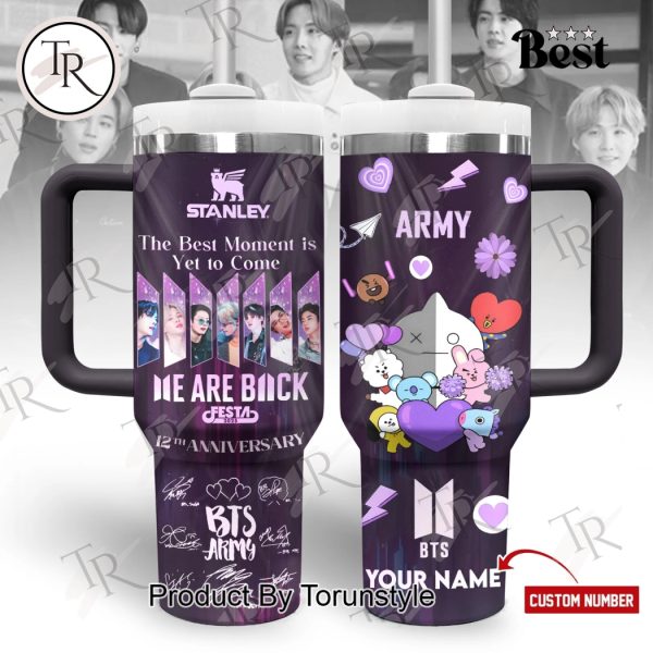 This 40oz tumbler stands out with a deep purple and black color scheme, symbolizing loyalty and unity. One side features a vertical layout of illustrated portraits representing the group, framed within angular, light-purple panels that create a dynamic, stage-like effect. Above them, the phrase “The Best Moment Is Yet To Come” is printed in clean, white lettering, centered near the top for immediate visual impact. Below, “WE ARE BACK (FESTA)” and “12th Anniversary” are stacked in bold, contrasting fonts, ensuring every milestone message is easy to read. The overall composition feels balanced and powerful, wrapping smoothly around the tumbler’s curved surface.