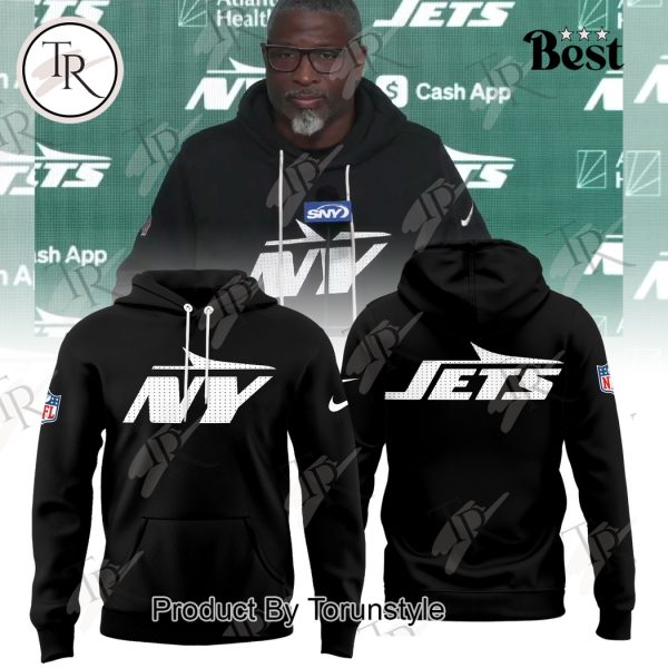 The New York Jets X Aaron Glenn 2025 Hoodie features a bold all-black base that highlights every design element with sharp contrast. On the front chest, the large “NYJ” graphic stretches across the center in bright white, composed of a dotted texture pattern that adds depth and a modern, athletic touch. Just above the lettering sits a streamlined jet emblem, angled forward to symbolize speed and momentum. The hoodie includes white drawstrings that complement the monochrome palette, enhancing both style and visibility. On the left sleeve, the official NFL shield patch is positioned neatly near the shoulder, adding authenticity and premium value.