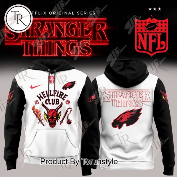 The Philadelphia Eagles “Hell Fire Club” Stranger Things 2025 Hoodie showcases an eye-catching combination of white and black fabric, creating a striking contrast from the hood to the sleeves. On the front, the dominant centerpiece is the Hellfire Club emblem, featuring a vivid red demonic face with yellow horns, sharp teeth, and weapons such as flaming swords and chains arranged symmetrically around it. Above this emblem is the NFL shield in red, sitting just below the neckline, while the Nike swoosh is printed on the right chest. The left chest carries a stylized red-and-black Eagles-inspired clawed hawk head, adding a fierce athletic touch.