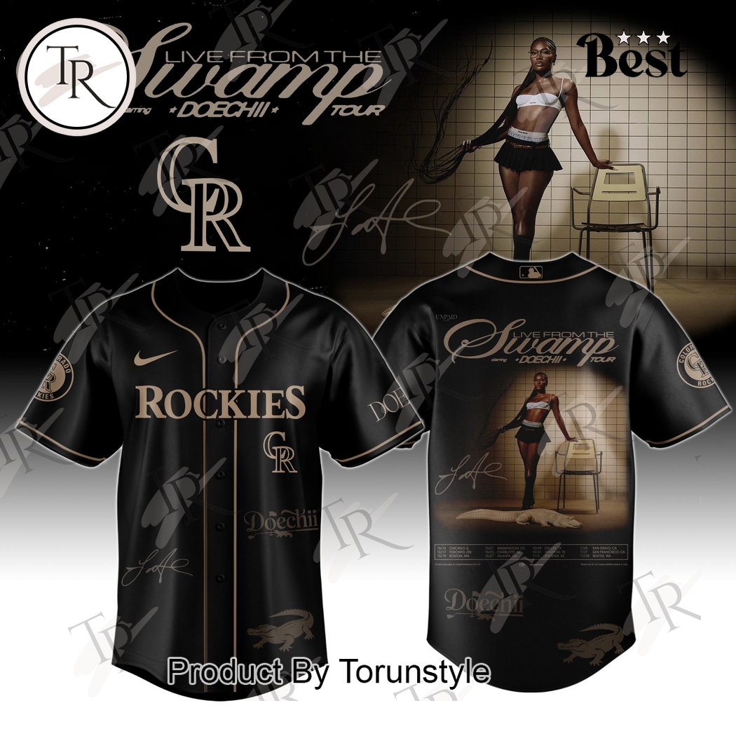 This unique Colorado Rockies X Doechii Tour 2025 “Live From The Swamp” Baseball Jersey represents a truly unprecedented convergence of professional sports and groundbreaking musical artistry, offering fans a distinctive and highly collectible garment. From the moment it’s unwrapped, the jersey immediately commands attention with its unconventional yet harmonious color palette. The base fabric, a premium, breathable performance polyester blend, is rendered in a deep, almost terrestrial forest green, subtly shifting to an oxidized charcoal grey, evoking the mysterious and lush depths of a swamp environment while retaining a sophisticated, urban edge. This material isn’t merely chosen for its aesthetic; it provides exceptional moisture-wicking properties, ensuring the wearer remains cool and dry whether they’re roaring from the stands at Coors Field, dancing in the electric atmosphere of a Doechii concert, or simply enjoying a warm day out. The relaxed, athletic cut allows for unrestricted movement and a comfortable drape, accommodating various body types and offering versatility for layering or wearing on its own.