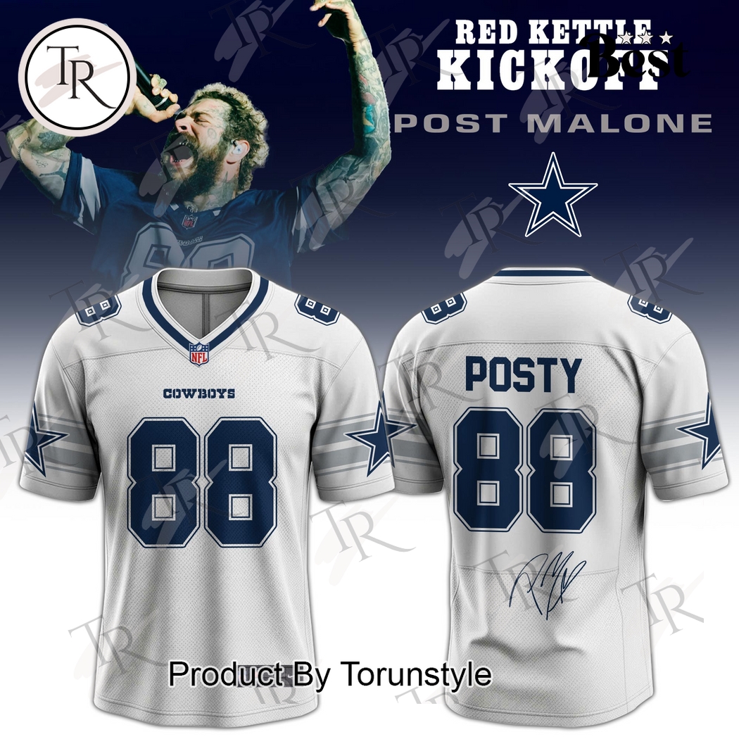 Furthermore, the jersey’s construction prioritizes authenticity and longevity. Reinforced stitching at critical stress points, a durable rib-knit collar, and an athletic cut ensure it can withstand the rigors of enthusiastic wear while maintaining its shape and integrity over time. Official NFL licensing tags and a unique holographic serial number are discreetly integrated, guaranteeing its authenticity and confirming its status as a genuine, limited-edition product. This detailed approach to quality and authentication addresses the needs of serious collectors who seek verified, high-value memorabilia. Beyond its physical attributes, owning this jersey communicates a distinct sense of style and cultural awareness. It signifies an appreciation for the intersection of sport, music, and philanthropy, allowing the wearer to make a statement that transcends mere fandom. It’s a conversation starter, a bold fashion piece, and a future heirloom all rolled into one. Potential buyers are not just investing in a jersey; they are acquiring a unique cultural touchstone, a wearable piece of history that captures a specific moment where the Dallas Cowboys, Post Malone, and a vital charitable cause converge in spectacular fashion. This is an unparalleled opportunity to possess an item that will only grow in significance and desirability as the 2025 Red Kettle Kickoff event approaches and becomes part of sports and music lore.