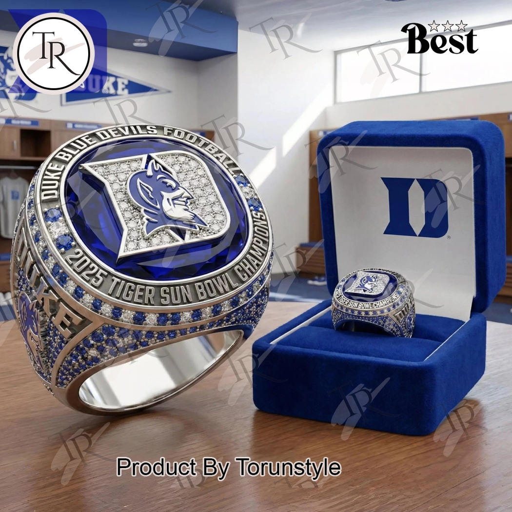 This exquisite Duke Blue Devils 2025 Tiger Sun Bowl Champions Ring stands as a monumental testament to an unforgettable season, meticulously designed for the ultimate fan, dedicated alumnus, or proud family member seeking to immortalize a historic triumph. It is more than mere jewelry; it is a tangible piece of Duke lore, an heirloom-quality creation that encapsulates the grit, glory, and unyielding spirit of the team’s dominant 2025 campaign. The ring’s formidable presence is immediately apparent, boasting a robust, championship-grade construction that commands attention and respect. Its central feature, a brilliant, custom-cut blue synthetic sapphire, is precisely faceted to capture and reflect light, symbolizing the Duke Blue Devils’ iconic colors and perhaps even the coveted Tiger Sun Bowl trophy itself. This magnificent stone is masterfully set within a bezel prominently engraved with “DUKE BLUE DEVILS” above and “2025 TIGER SUN BOWL CHAMPIONS” below, each letter sharply defined and polished to a brilliant sheen, ensuring every detail of this momentous victory is permanently etched. Flanking the central sapphire are two meticulously sculpted miniature representations of the official Tiger Sun Bowl logo, one on either side, each rendered with incredible precision, emphasizing the specific event that cemented this championship.