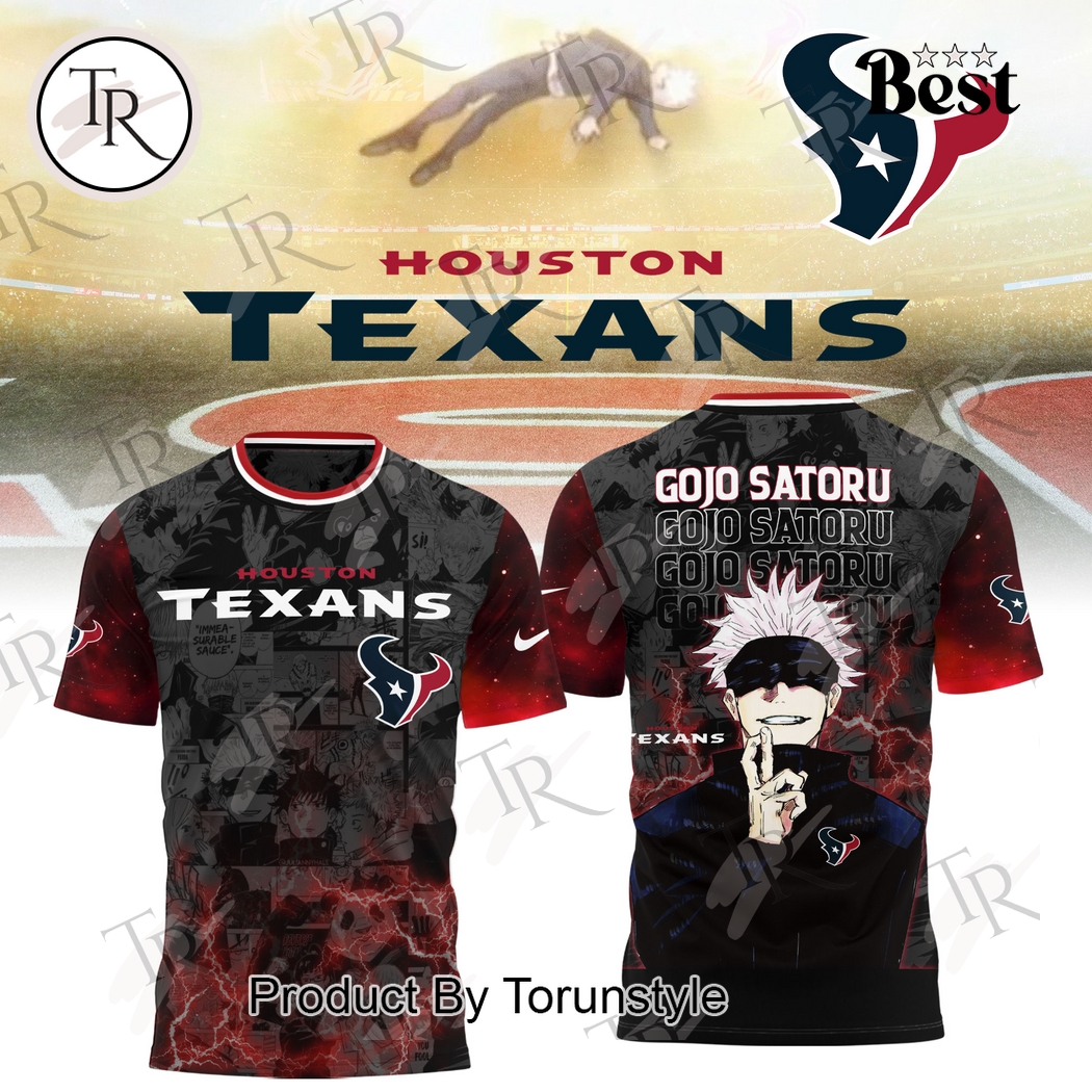 This exceptional garment represents a pinnacle of cross-cultural fandom, seamlessly fusing the aggressive spirit of the Houston Texans with the enigmatic power of Jujutsu Kaisen’s Gojo Satoru. It stands as more than just an item of clothing; it’s a wearable testament to diverse passions, meticulously designed to cater to a unique demographic that cherishes both American football and Japanese anime. The hoodie’s core appeal lies in its audacious yet harmonious design, which features the iconic Texans bullhead logo and team colors artfully intertwined with a dynamic portrayal of Gojo Satoru. Imagine Gojo, perhaps in his signature blindfold or with his mesmerizing Six Eyes, striking a powerful pose, subtly or overtly incorporating Texans elements into his mystical aura. This isn’t merely two separate logos slapped together; rather, it’s an artistic collaboration where the vibrant Battle Red and Deep Steel Blue of the Texans complement the supernatural aesthetic of Gojo, creating a visual narrative that speaks volumes about the wearer’s multifaceted identity. The graphic print itself is of paramount quality, utilizing advanced screen-printing techniques that ensure a crisp, high-definition image with remarkable color fidelity, resistant to fading or cracking even after numerous washes. Every detail, from Gojo’s characteristic white hair to the intricate lines of the Texans’ logo, is rendered with precision, making the design truly pop and become a conversation starter.